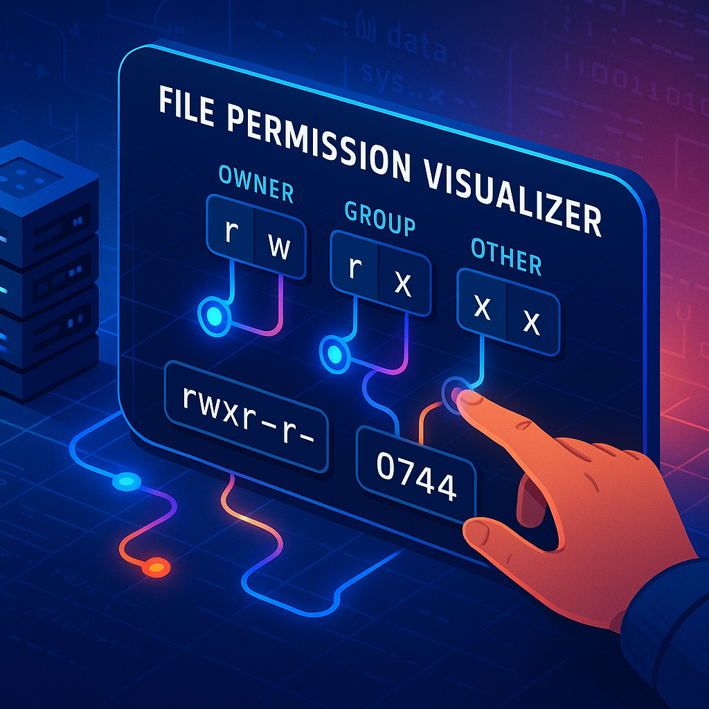 Visually construct and simulate Unix file permissions using toggle-based rwx selectors and live octal/symbolic output.